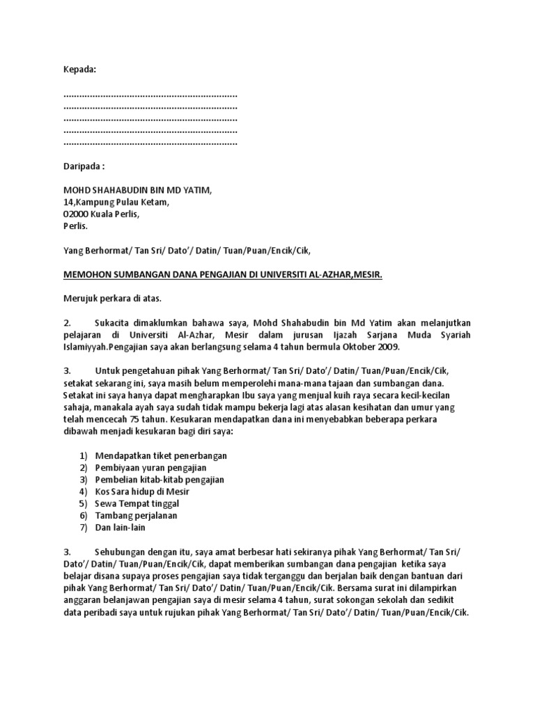 Kerjasama dan keperihatinan dari pihak tuan amat dihargai dan didahului dengan. 5 Contoh Surat Permohonan Bantuan Modal Usaha. Uploaded by Loman Anak Chagat.